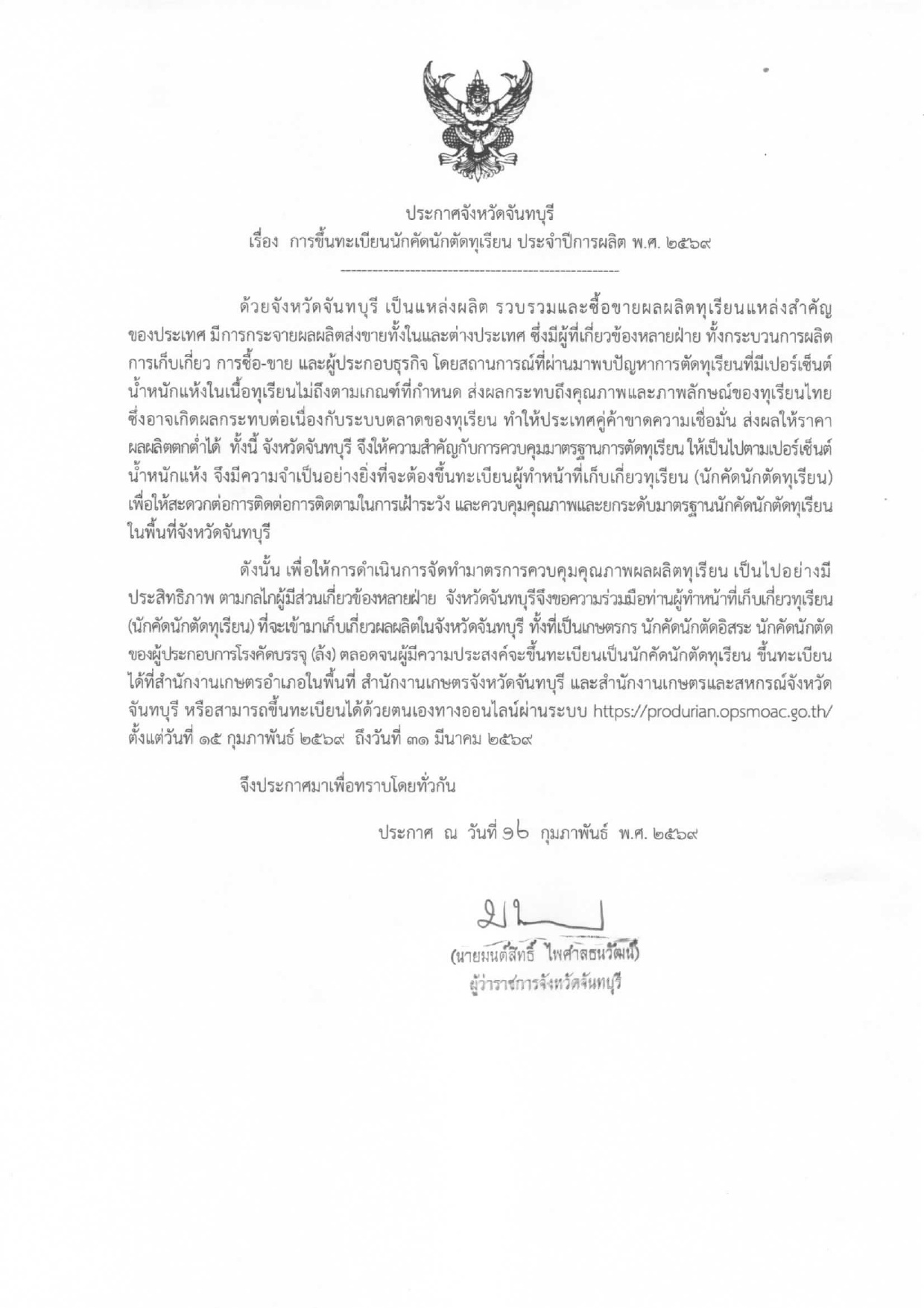 จึงขอเชิญชวนผู้ทำหน้าที่นักคัดนักตัดทุเรียน ทั้งที่เป็นเกษตรกร นักคัดนักตัดอิสระ นักคัดนักตัดของผู้ประกอบการโรงคัดบรรจุ (ล้ง) ตลอดจนผู้มีความประสงค์จะขึ้นทะเบียนเป็นนักคัดนักตัดทุเรียน ที่จะเข้ามาเก็บเกี่ยวผลผลิตดำเนินการขึ้นทะเบียนนักคัดนักตัดทุเรียน กับ กระทรวงเกษตรและสหกรณ์